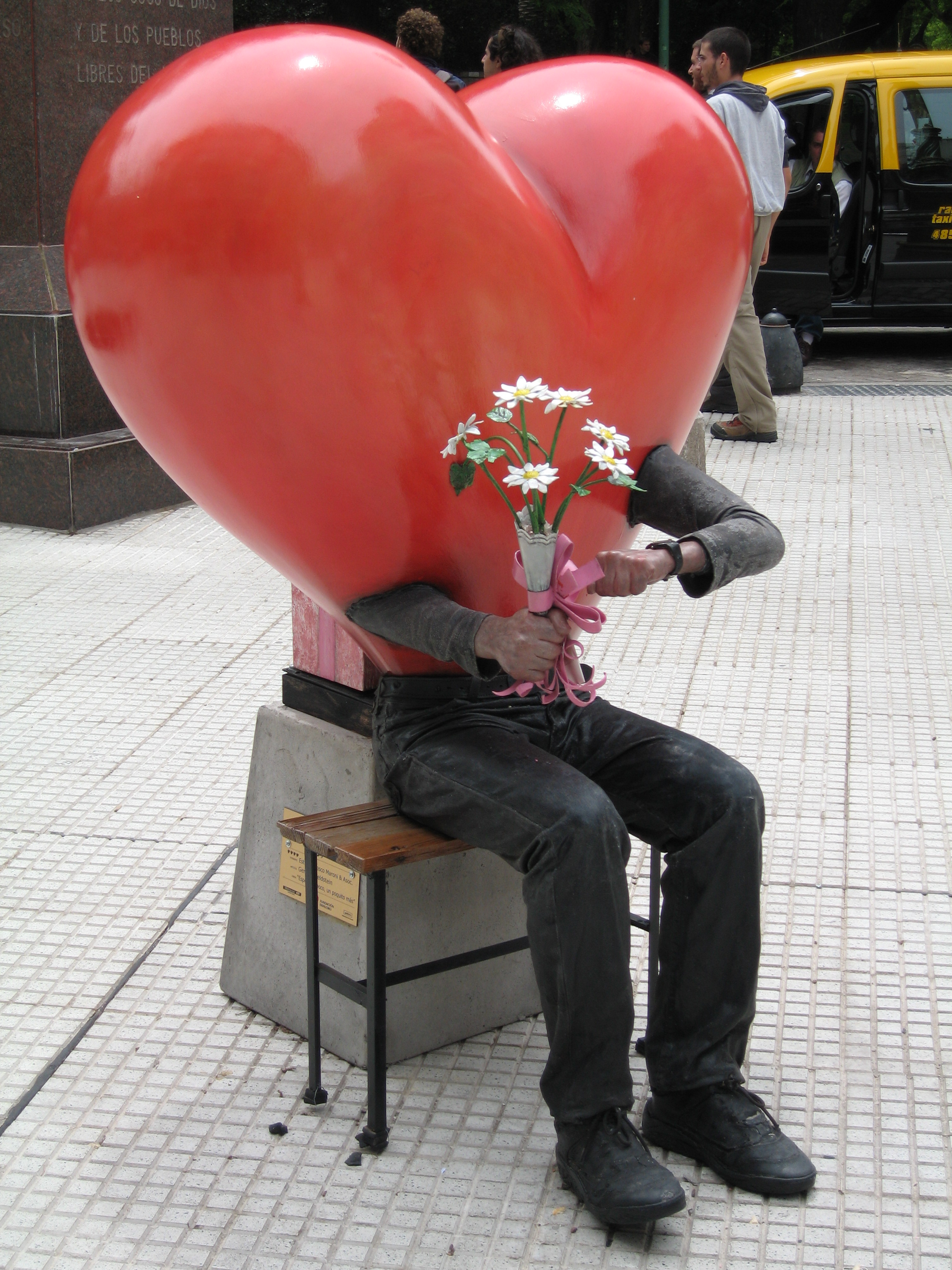 “el enamorado espera a su amada con gran impaciencia, mientras su cuerpo y su alma explotan de amor” El corazón será intervenido pictórica y escultóricamente. Se construirá la figura de un hombre sentado (sobre una base) cuya parte superior –desde la cintura- será el corazón coloreado con pintura acrílica roja. Emergerán de el, sus brazos y manos que, al igual que sus piernas, serán realizadas de manera hiperrealista. En su mano derecha sostendrá un ramito de flores (artificiales). En su muñeca izquierda, un tanto elevada, llevara un reloj. Las piernas, adheridas a la base, se compondrán de una estructura de hierro y madera recubierta de telas encoladas para otorgarles volumen y finalmente “vestida” con pantalones y calzado reales. Para la fijación de los brazos y las manos – realizadas en resina- se insertará una estructura de hierro, a través de incisiones en el corazón, que se sujetara al soporte del mismo y/o a la base –según sus características constructivas-. Todos los elementos serán recubiertos con siliconas y/o resinas para su protección e impermeabilización. |