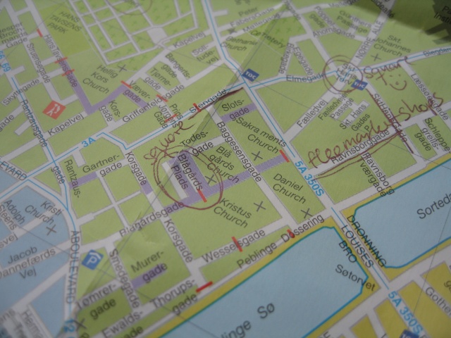 | This is the map where Pia, then woman I met at Loppen, highlighted some of the things she liked in Norrebro, including some nice antique stores and squares. I headed over there to check out the area. | |