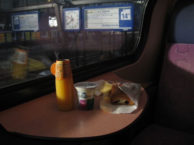 | I took a train to Den Haag Centraal to visit a friend. This was my breakfast that I ate on the way there. | |
