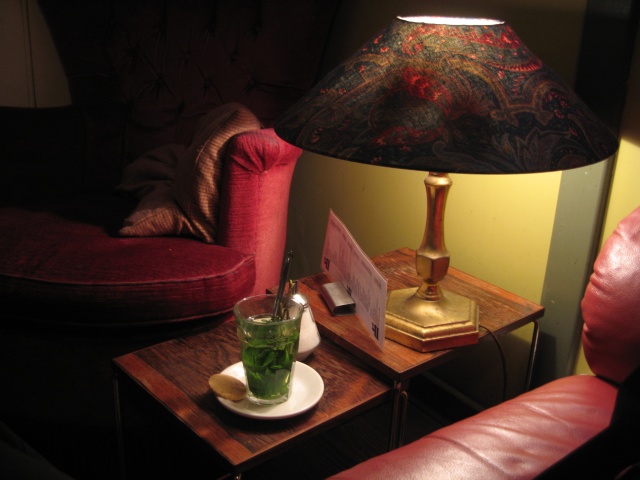 | The evening began with fresh mint tea at Skek while I waited for a friend to join me. It was fairly crowded when I got there, but there was a free spot in the corner with a cozy couch and chair to relax in. We later had nice meal here (tasty veggie burger with fries and salad), and this was probably one of my favorite places from the trip. The staff were really friendly -- if I lived in Amsterdam, I'd come here often! | |