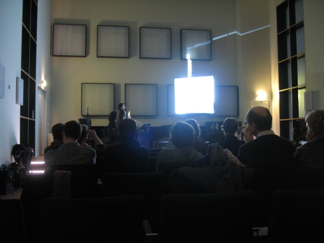 | Next door to the library is the Conservatorium van Amsterdam. I went to two shows there: one was a mix of 6 electronic music pieces entitled Current Densities and the other was the "end exam" of a violin student named Izaskun Echeveste. The electronic music featured the first piece I've seen where someone used a wii controller to summon up percussive noise to accompany the performance. | |