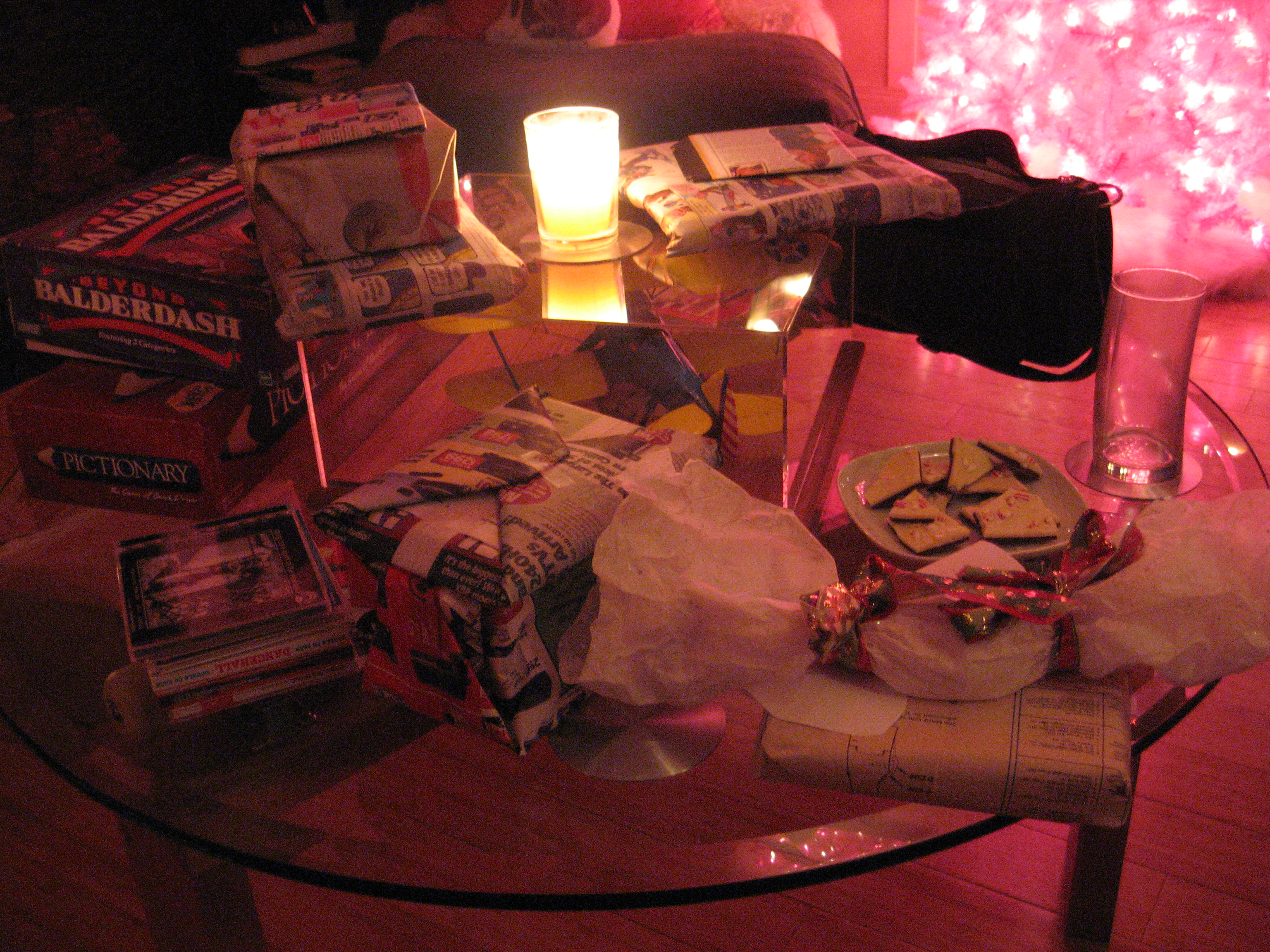 | After dinner, we did a nice gift exchange and played Balderdash. Also noteworthy is the Peppermint Bark from Williams-Sonoma, which disappeared in seconds once it was in my reach! | |