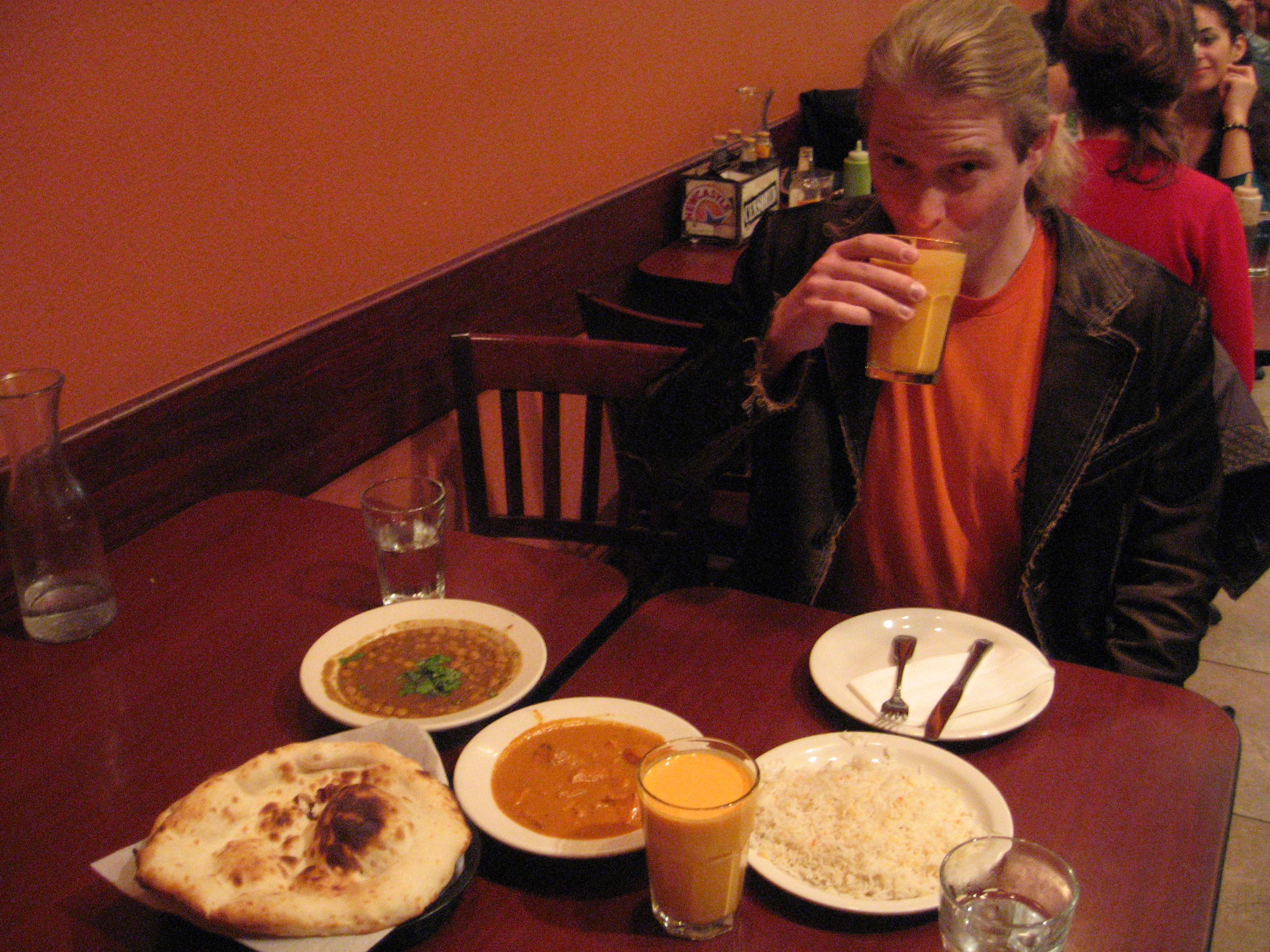 | I swung back across the bay to meet Danek at Pakwan. This was delicious and very inexpensive compared to prices in London. Mmmm, mango lassi. | |