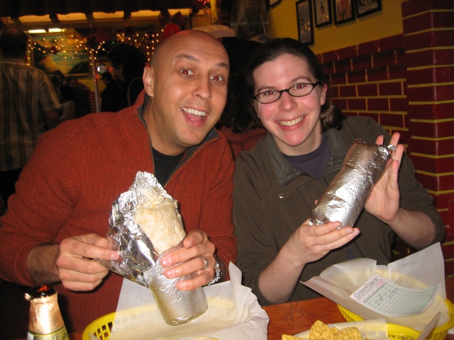 | Josh was also there, and you can see us posing with glee with our burritos. I still think Taqueria Cancun has the best vegetarian super burrito that I've tried, and I try to get back there on every visit to SF. That fresh avocado is perfect! | |